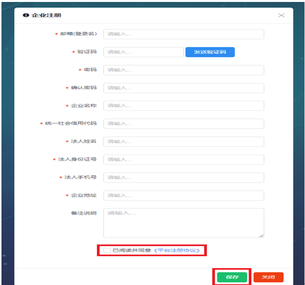 3.企业注册页面中,*为必填项,阅读《平台注册协议》并同意后,勾选【已阅读并同意《平台注册协议》】,点击【保存】即可,如图3: