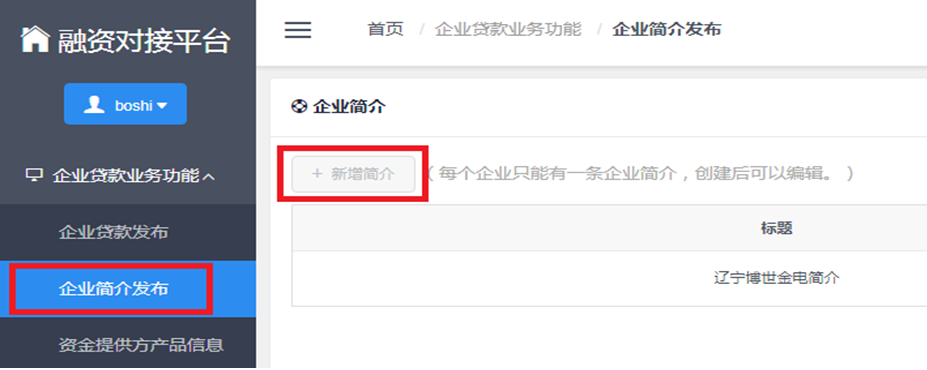 发布企业简介:登陆成功后,进入融资对接平台,首先记得发布简介(以提高获得融资成功率),在【企业贷款业务功能】中点击【企业简介发布】→【新增简介】(以人行测试号boshi为例),如图5: