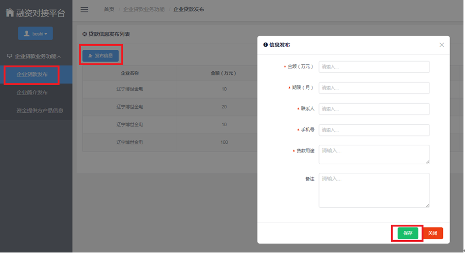 发布企业融资需求:点击【企业贷款发布】→【发布信息】,*为必填项,填完信息后点击【保存】,如图6: