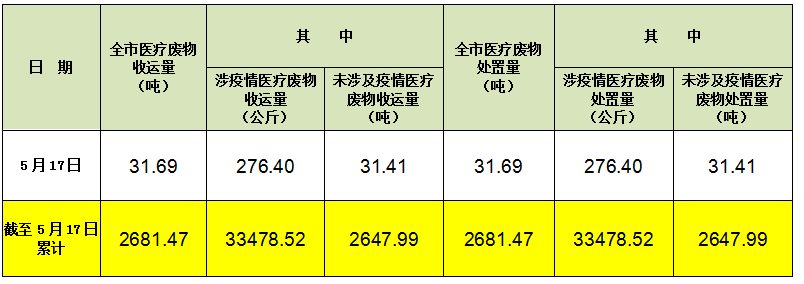 5月17日,全市医疗废物收运量为31.69吨,处置31.69吨。其中,涉及疫情医疗废物收运量276.40公斤,处置量276.40公斤。自2020年1月22日起,截至5月17日,我市医疗废物累计收运量为2681.47吨,处置2681.47吨;其中,涉及疫情医疗废物累计收运量33478.52公斤,累计处置量33478.52公斤。
