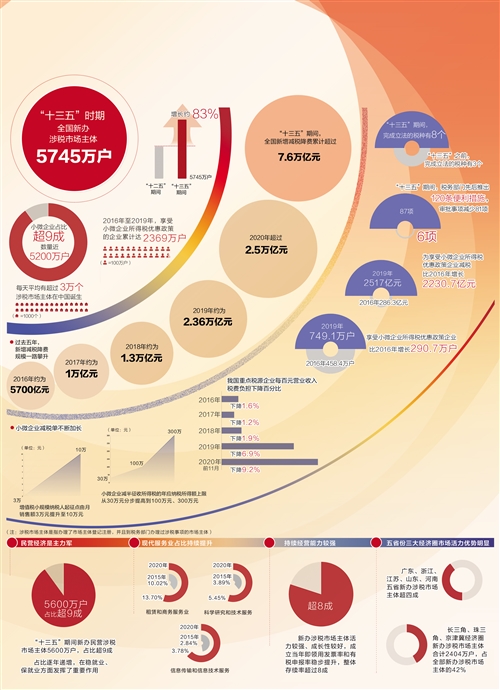 “十三五”期间,全国新办涉税市场主体共5745万户,年均超千万户,较“十二五”时期增长83%。其中,新办民营涉税市场主体5600万户,民营经济在稳就业方面发挥了重要作用。更喜人的是,新办涉税市场主体中,现代服务业的占比不断提高,充分体现了我国服务业转型取得明显成效,经济结构得到持续优化,新经济新动能正在茁壮成长。