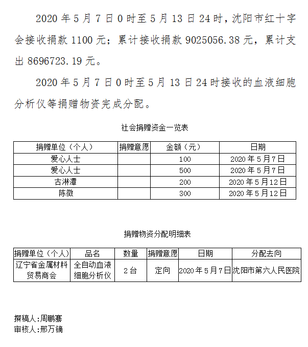 沈阳市红十字会接收、分配社会捐赠款物公告(九十二)