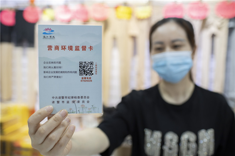 浙江省诸暨市一经营户展示“营商环境监督卡”,诸暨市推出“营商环境监督卡”,助力复工复产,服务保障经济稳健发展。